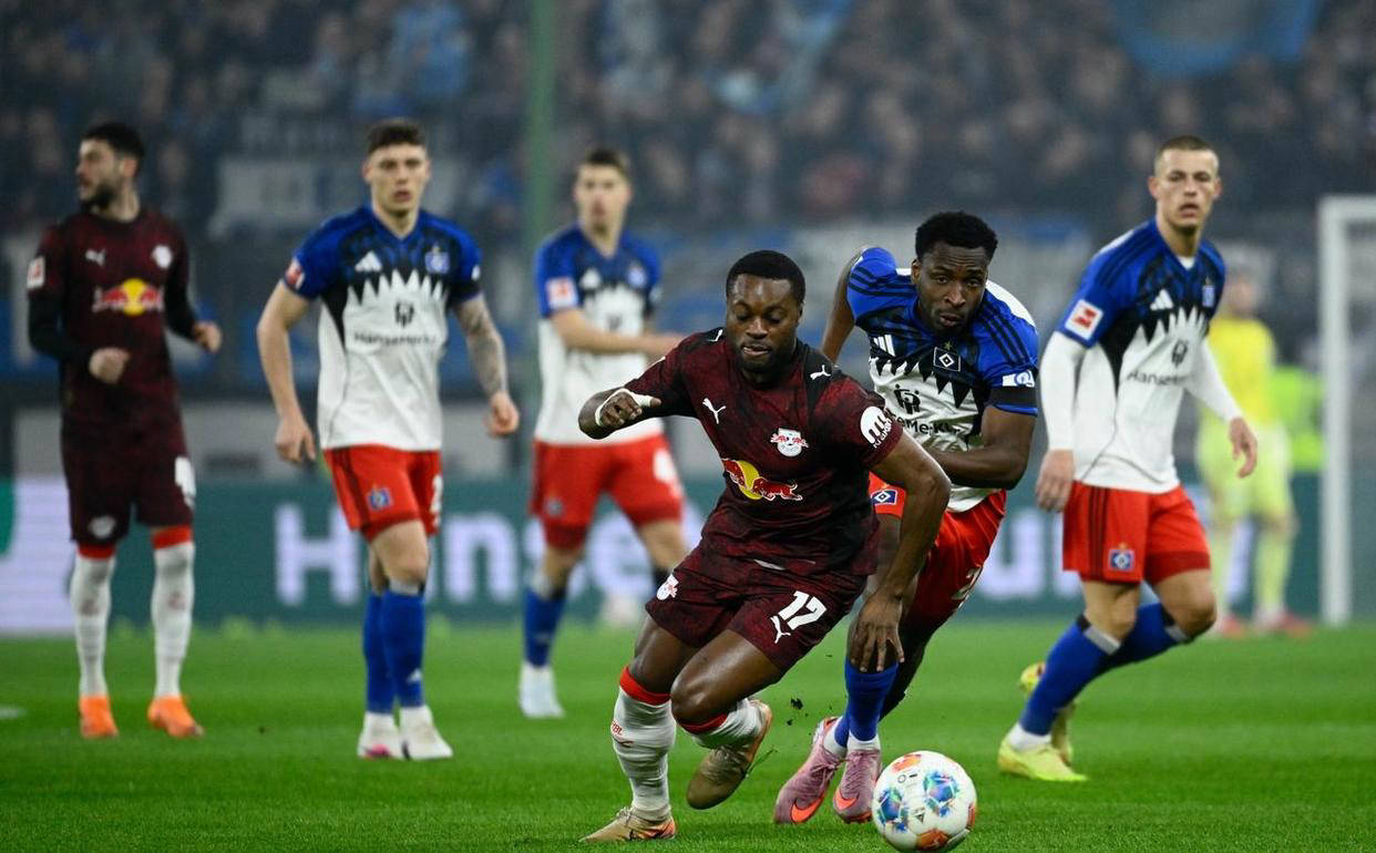 德甲第24轮:莱比锡2-1逆转汉堡,24岁巴西悍将罗慕洛精彩脚后跟破门